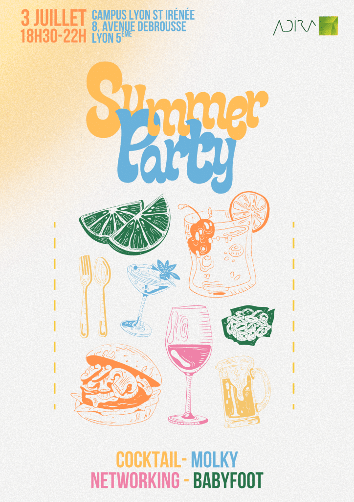 Le 3 juillet prochain, rejoignez-nous pour la Summer Party de l’ADIRA, un moment festif & convivial réservé à tous nos adhérents ! L’occasion parfaite de se retrouver, de s’amuser et de partager un bon moment ensemble avant l’été, dans une ambiance conviviale. Au programme : cocktail dinatoire, jeux en tout genre, parties de baby-foot endiablées, musique entraînante et une vue panoramique à couper le souffle sur tout Lyon. Alors ne manquez pas cet événement phare de l’été et inscrivez-vous vite !